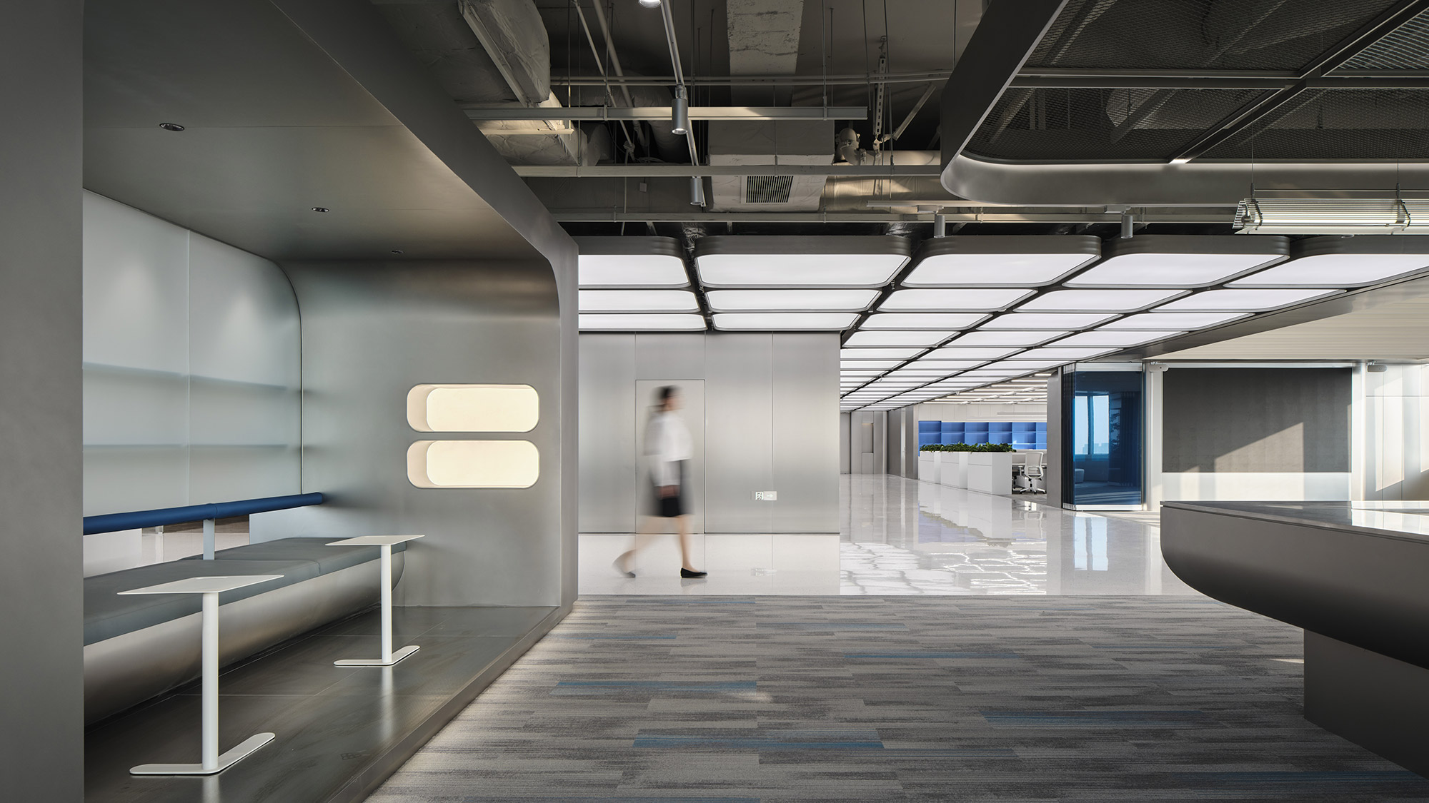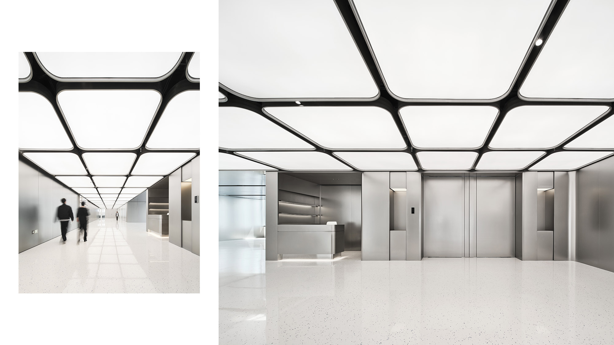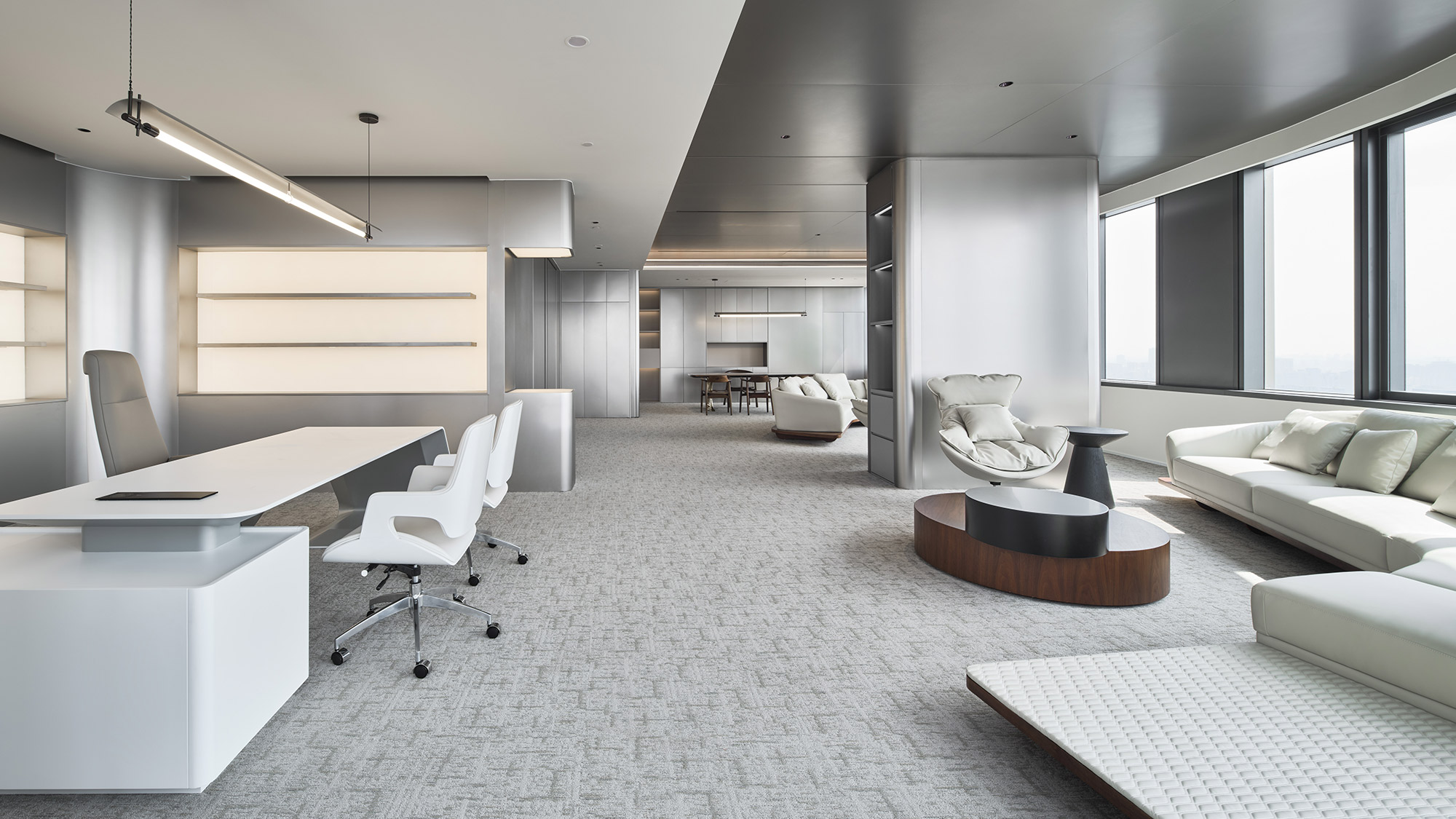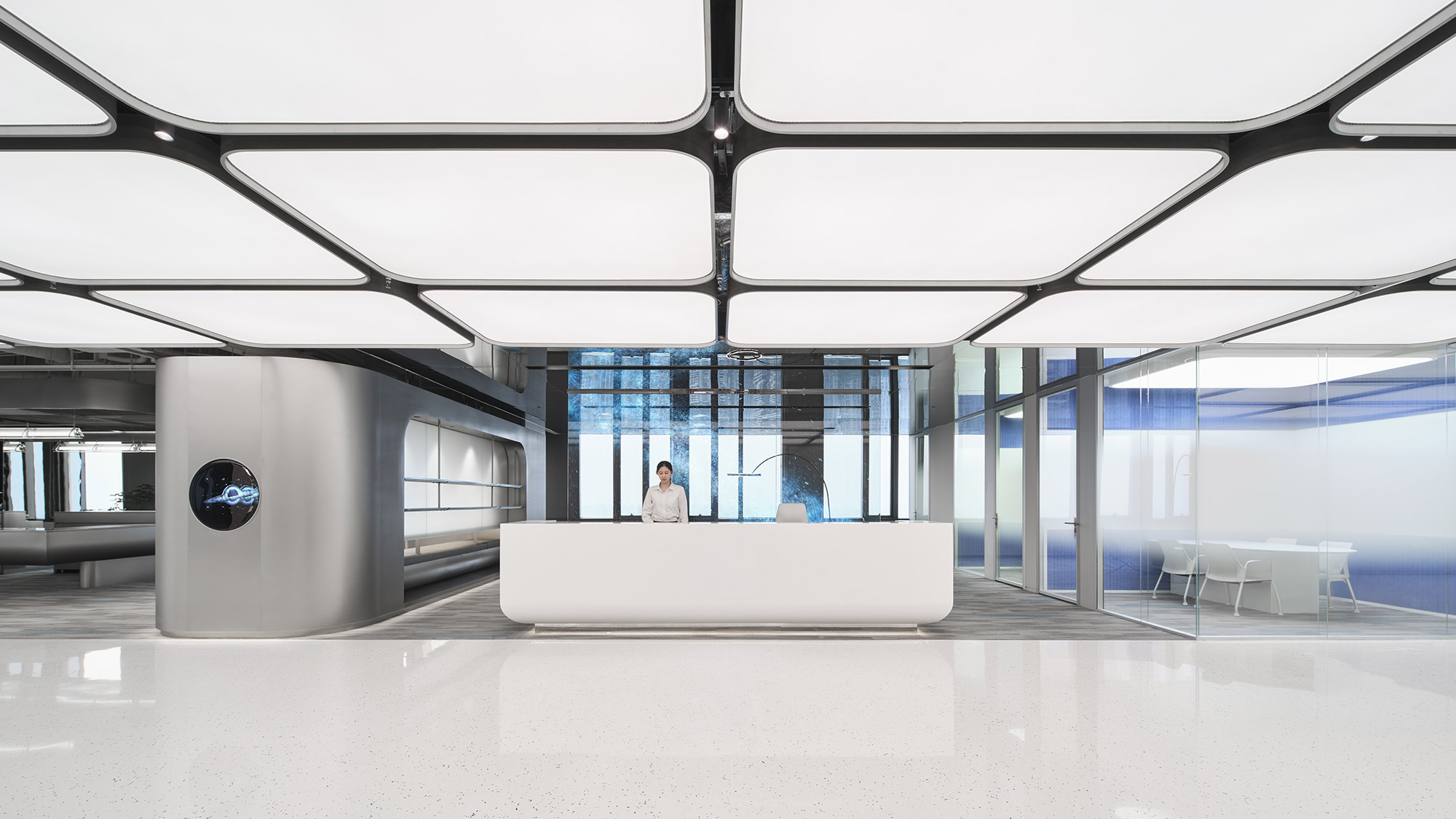 Located at Ruihong Corporate Avenue in Shanghai’s North Bund, this tech finance headquarters occupies an entire high-rise office floor. Conceived as a “space station,” the design integrates workplace, reception, display, training, and social functions within a continuous and restrained spatial system. A palette of silver white and cool grey, together with matrix lighting, a circular gallery, a flexible event space, and panoramic executive areas, creates a headquarters environment defined by precision, clarity, and a forward-looking vision.
